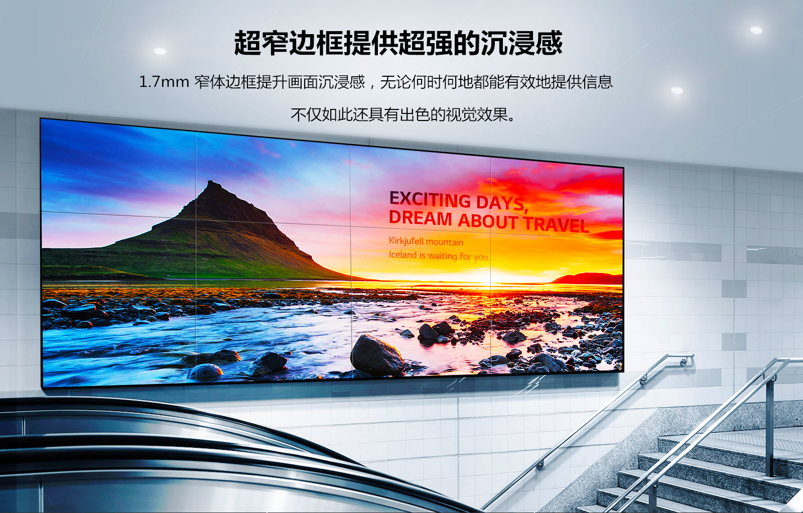 46寸1.7mm液晶拼接屏采用韓國三星原裝工業級面板,超窄邊框設計,享受視覺零距離,1.7mm超窄邊框提升畫面沉浸感,無論何時何地都能有效的提供信息,不僅如此還具有出色的視覺效果,多塊屏幕一起拼接間距僅為1.7mm。支持1×2;1×3;2×2;2×3……更多單元拼接。該系列46寸拼接屏長寬高尺寸為:1020.02*574.61*74.5mm。