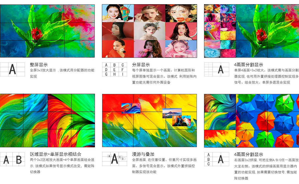 ②智能拼接,任意組合:客戶需求,怎么顯示怎么來;個性化個性設計、靈活多變、滿足不同需求、支持定制;多樣化的圖像拼接顯示,可以整屏顯示、分屏顯示、多畫面分割顯示、區域顯示加單屏顯示相結合、漫游與疊加。